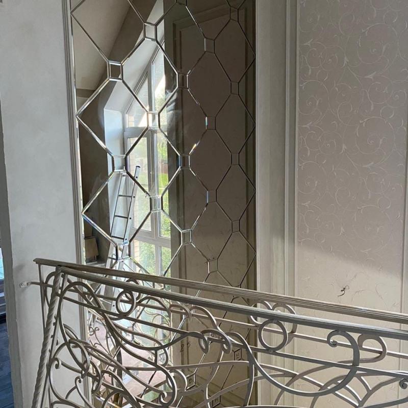 Использована зеркальная квадратная и треугольная плитка с фацетом.